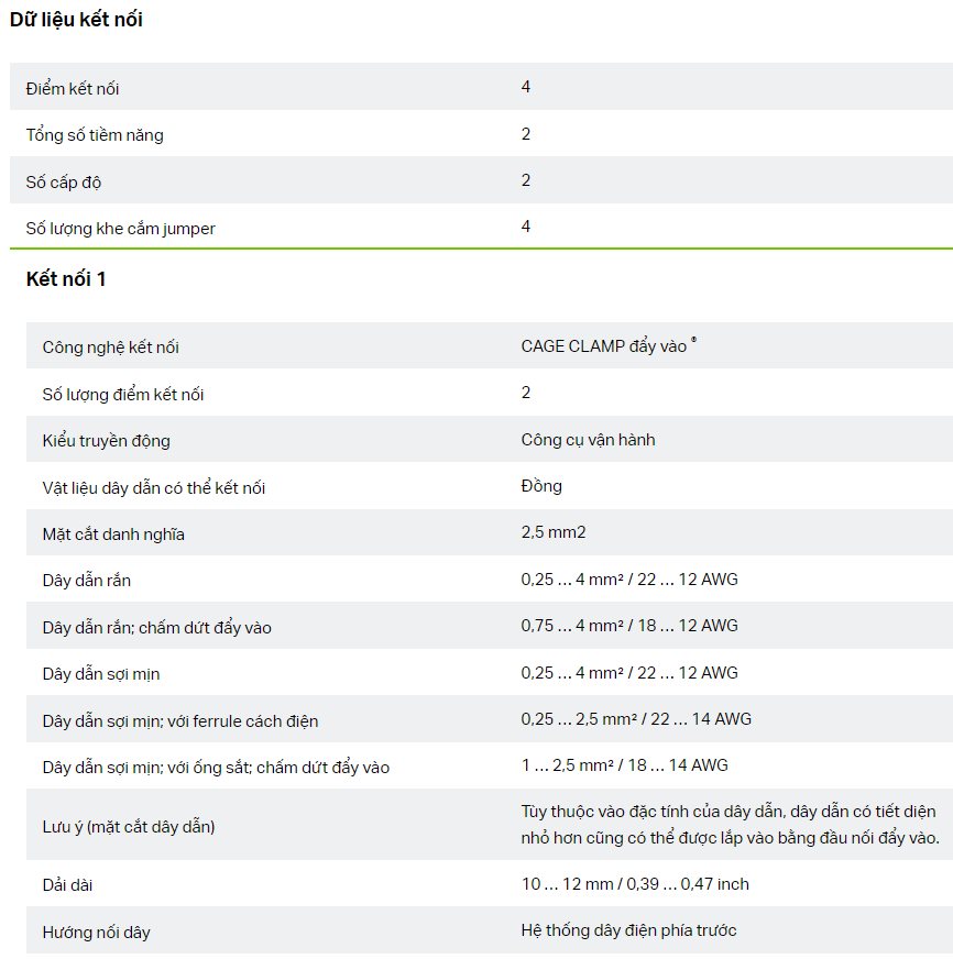 Sản phẩm này kết hợp công nghệ Push-in CAGE CLAMP®, cho phép cắm dây trực tiếp không cần dụng cụ, đảm bảo kết nối chắc chắn và ổn định cho mọi loại dây dẫn.