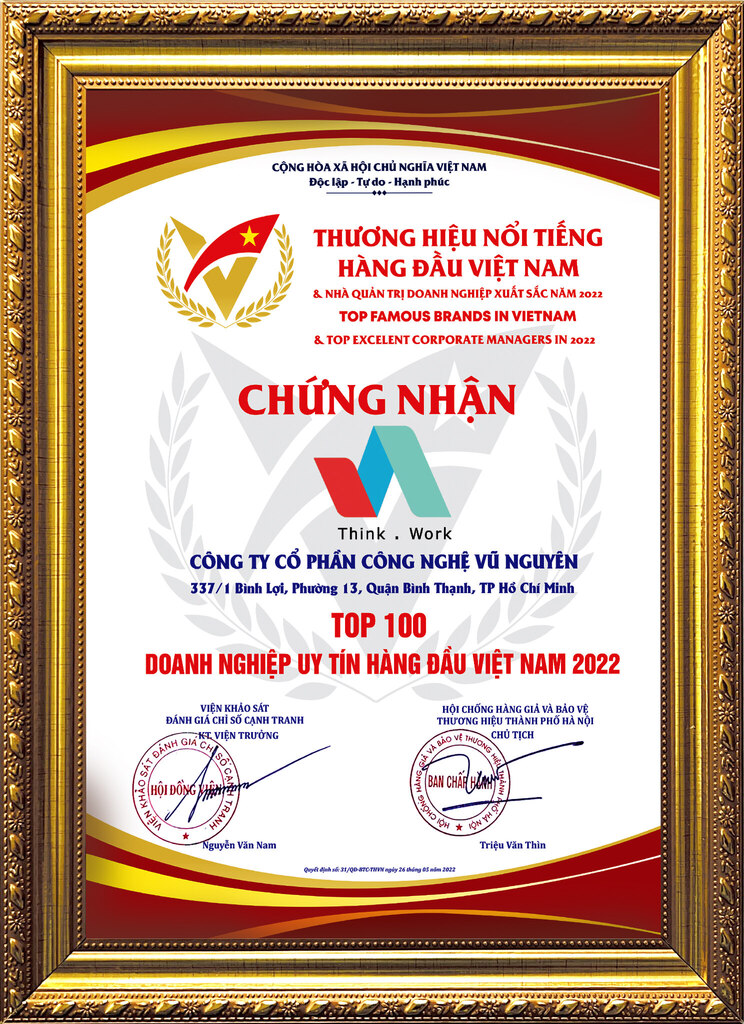 Công ty CP Công Nghệ Vũ Nguyên vào "Top 100 Thương hiệu doanh nghiệp nổi tiếng uy tín hàng đầu năm 2022."